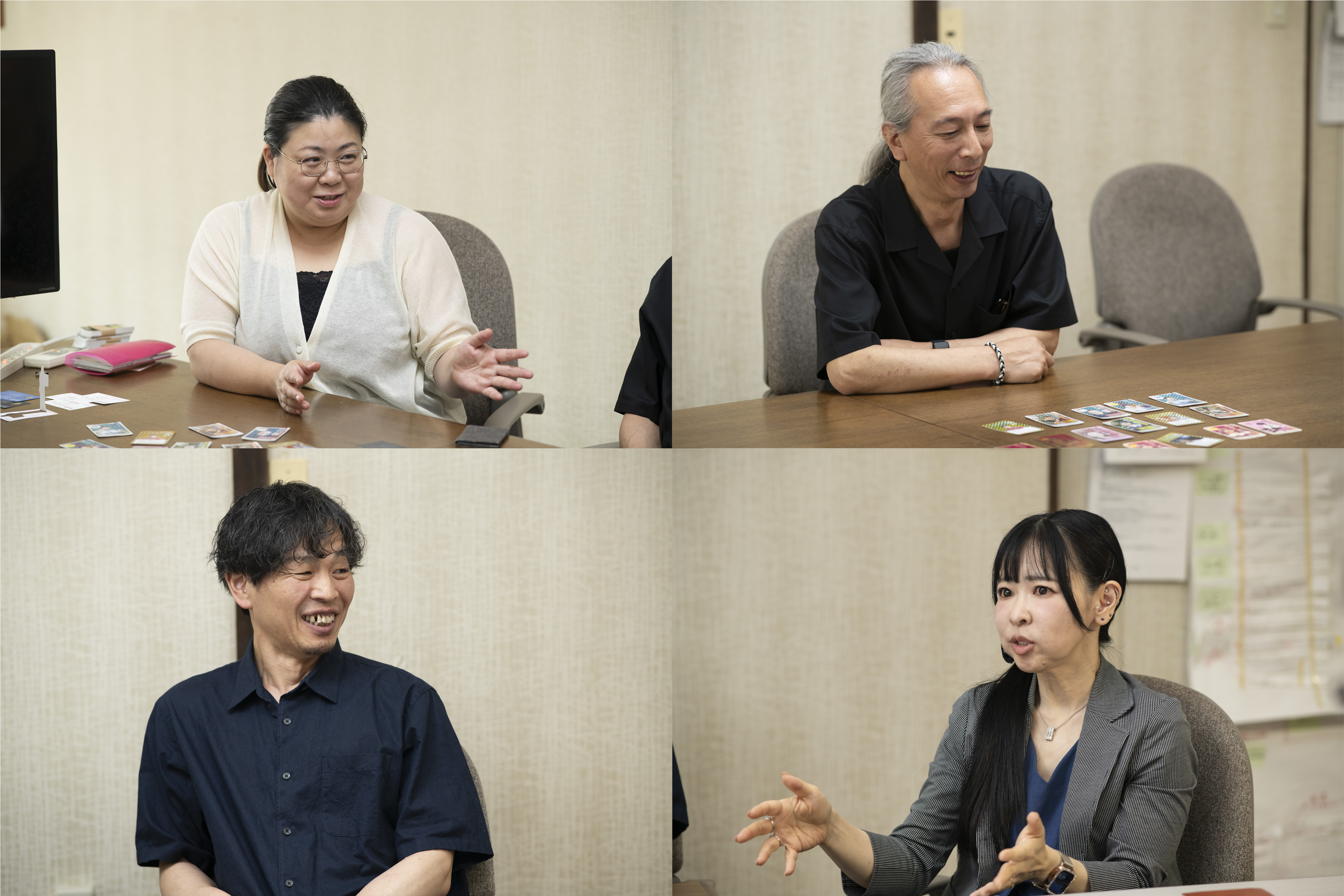 それぞれの立場から想いやこだわりを話す(左上:田村社長、右上:生産課課長 西村様、左下:生産課 城戸様、右下:統括管理部長 坂本様)