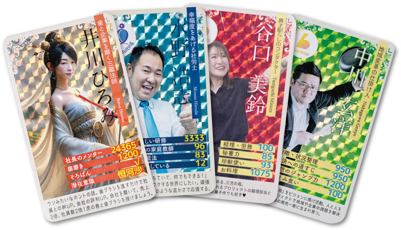 取材時の名刺交換で田村社長の手元から出てきたのは、わくわく工場長と名乗るキラキラした名刺(以降、正しくはキャラクターカード)。この明るく笑顔が絶えない田村社長が考案したキャラクターカードは、社長の想いが託されている企画商材です。